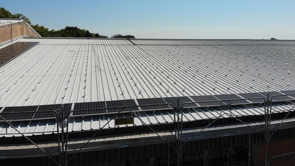 Deuxième étape, lé dépose de la toiture a du se faire par tranche de 300m² pour déposer les parties en fibrociment, renforcer la toiture, et poser la nouvelle couverture en acier en une seule journée ! L’objectif : garder le bâtiment hors d’eau.
